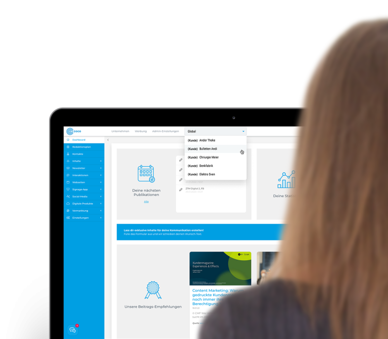 COCO ermöglicht es dir, hunderte Kundeninstanzen zentral zu managen. Baue Websites auf, schalte Online-Kampagnen oder steuere die Social Media Kanäle deiner Kunden. Inhalte kannst du direkt auf den Kundenkanälen veröffentlichen oder ihnen über COCO zur Freigabe zusenden. Das spart dir viele Ressourcen und hilft dir, wiederkehrende Umsätze zu generieren.
