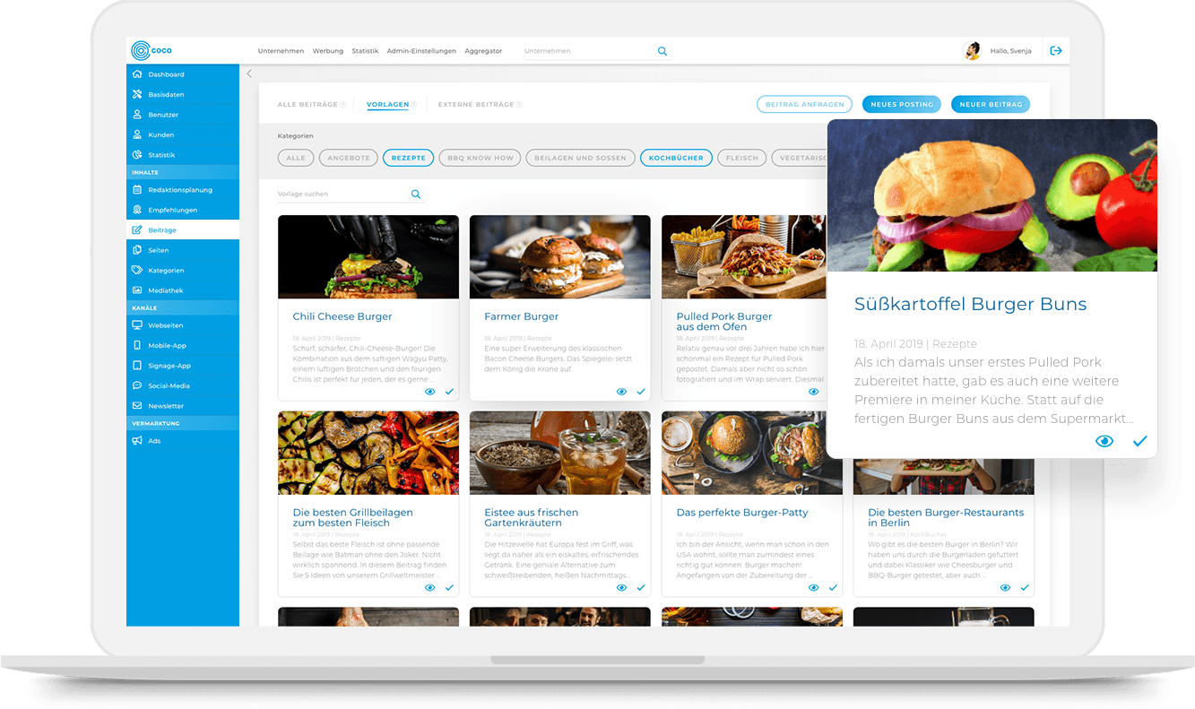 Eigene Inhalte, Inhalte von Partnern oder Informationen über Schnittstellen In COCO hast du Zugriff auf redaktionelle Beiträge und Texte, die für deine Branche bedeutend sind. Nutze sie für deine Kanäle und bleibe mit deiner Zielgruppe in Kontakt.