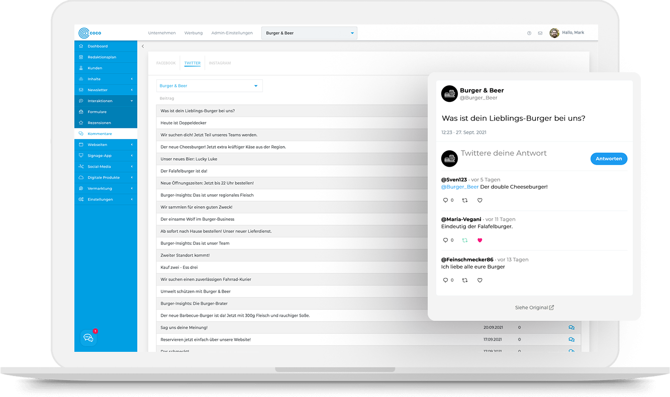 Auf Kommentare und Rezensionen antworten Werden deine Beiträge auf Facebook, Twitter oder Instagram kommentiert, erhältst du direkt eine Benachrichtigung über COCO und kannst über das System auf Kommentare antworten. Auch Rezensionen von Google My Business werden in COCO ausgegeben und du kannst sie beantworten. Damit hast du alles an einem zentralen Platz.