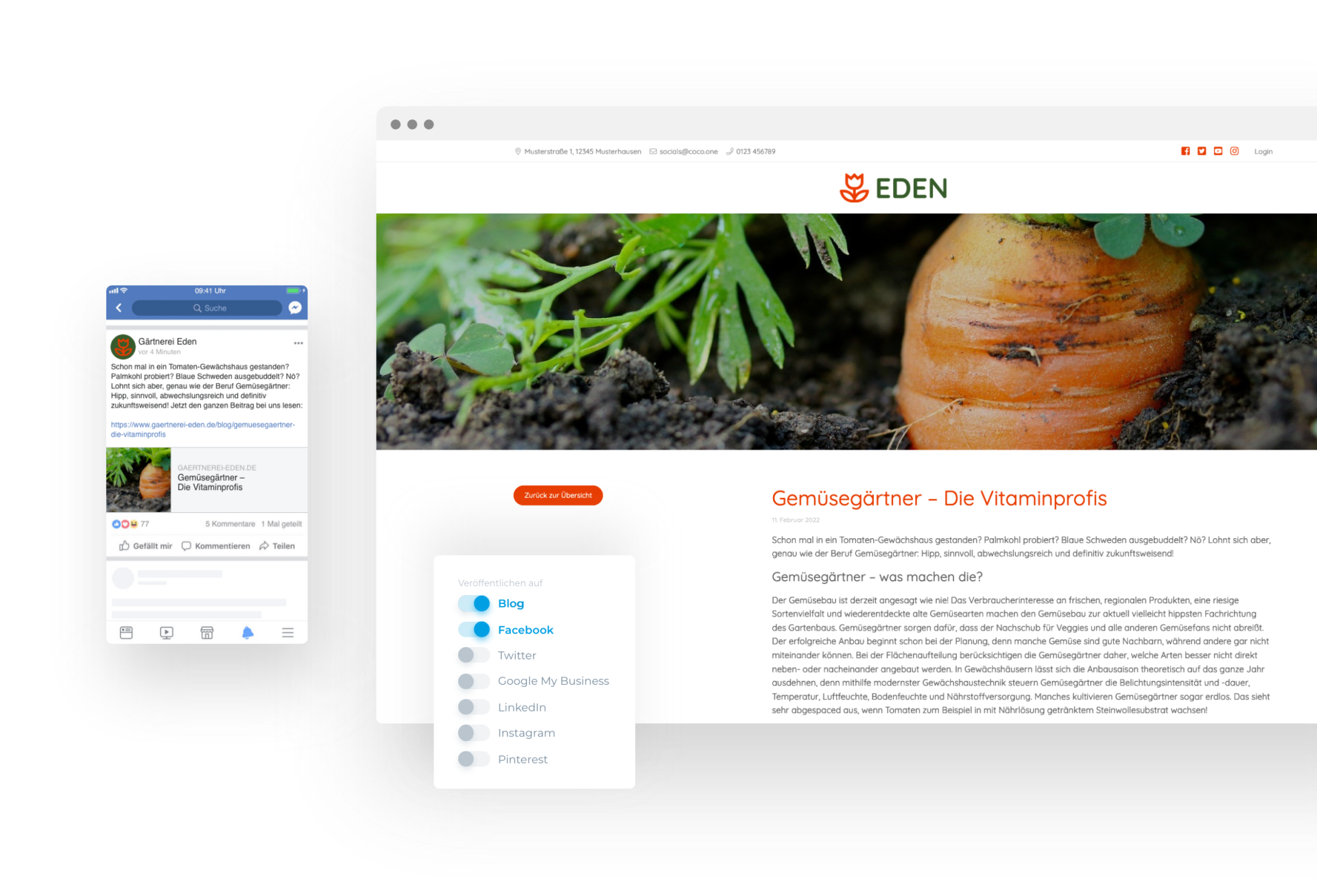 Mit COCO kannst du Inhalte mit wenigen Klicks in deinem Blog, deinen angebundenen Social Media Kanälen und deinem Google My Business Profil veröffentlichen.