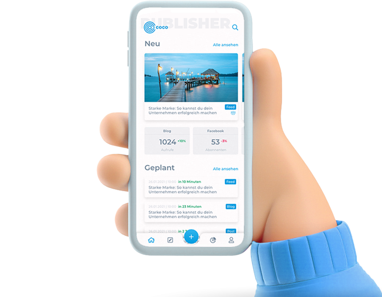 COCO vereint relevante Kommunikationskanäle und Funktionen in einem Marketing System. Durch den All-in-One-Ansatz wird es möglich, Inhalte zentral zu erstellen und mit einem Klick, an den jeweiligen Kanal angepasst, zu veröffentlichen. Mit unserer Publisher App funktioniert das auch über dein Smartphone. Mit COCO kommunizierst du zielgerichteter, bist effizienter und hast ein Team an deiner Seite, das dich tatkräftig unterstützt.
