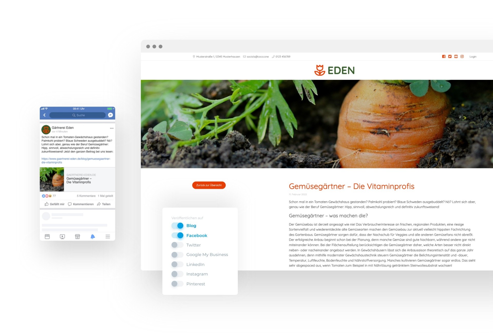 COCO vereint relevante Kanäle und Funktionen in einem Marketing System. Durch den All-in-One-Ansatz wird es möglich, Inhalte zentral hochzuladen und mit einem Klick, an den jeweiligen Kanal angepasst, effizient zu veröffentlichen. Die Erstellung und Veröffentlichung von Inhalten funktioniert mit der Publisher-App auch über das Smartphone. Mit COCO lösen wir Herausforderungen für dich: Du sparst Zeit und hast ein Team an deiner Seite, dass dich tatkräftig unterstützt.