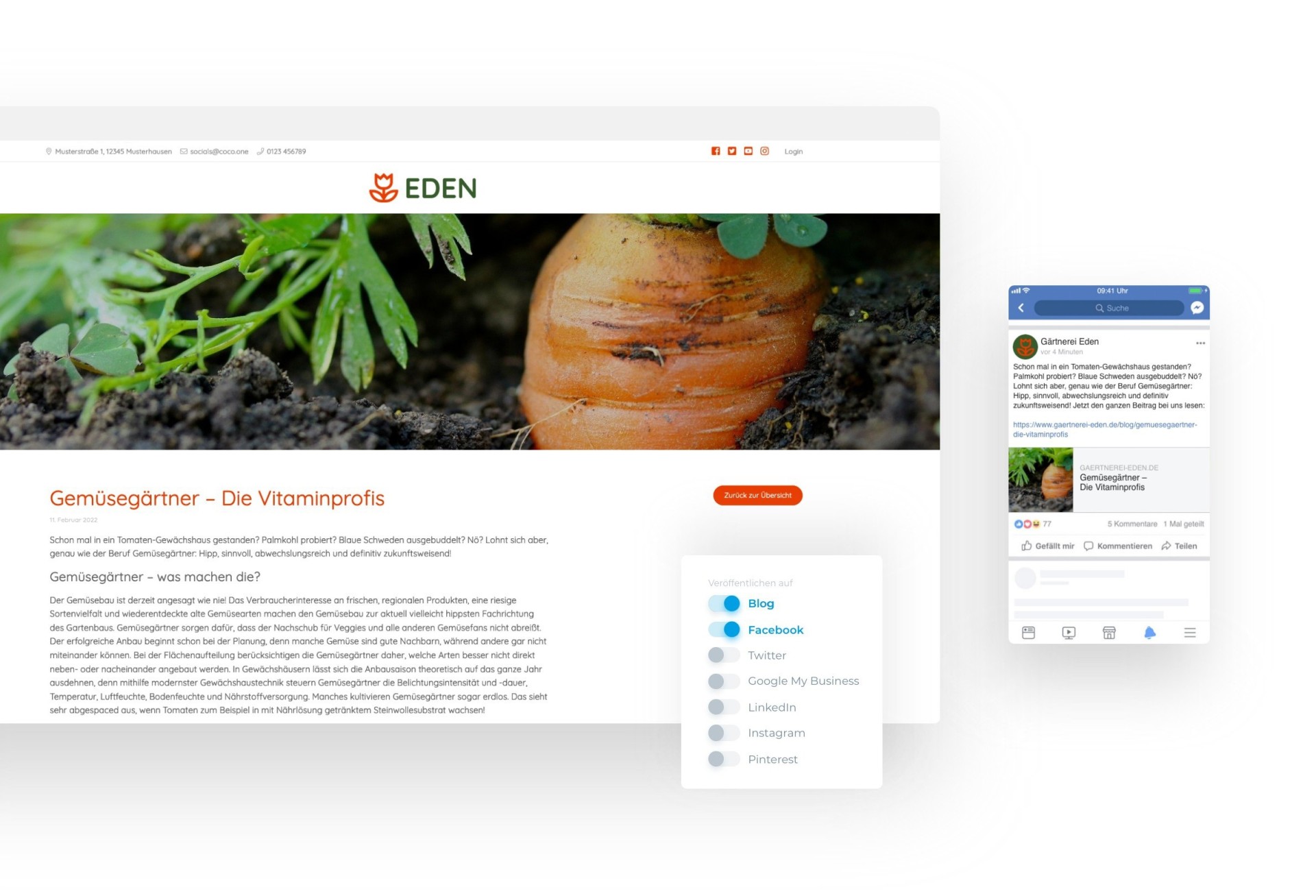 Um Reichweite für deine Themen zu generieren, kannst du deine Inhalte direkt auch auf deinen Social Media Kanälen veröffentlichen. Zum jetzigen Zeitpunkt kannst du über COCO deine Inhalte direkt bei Facebook, Instagram, LinkedIn, Google My Business, Pinterest und Twitter posten. Mit wenig Klicks veröffentlichst du deine Inhalte in den gewünschten Kanälen.